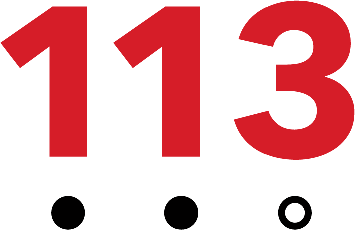 Het compacte logo bestaat uit de cijfers 113 in rood met daaronder 2 gesloten en één open bolletje.